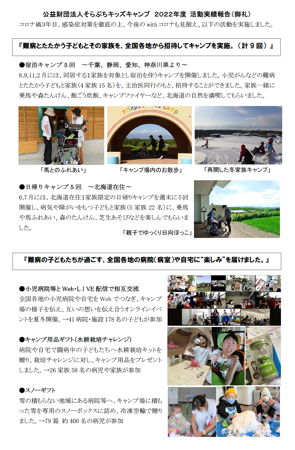 難病とたたかう子どもとその家族を、全国各地から招待してキャンプを実施。(計9回)